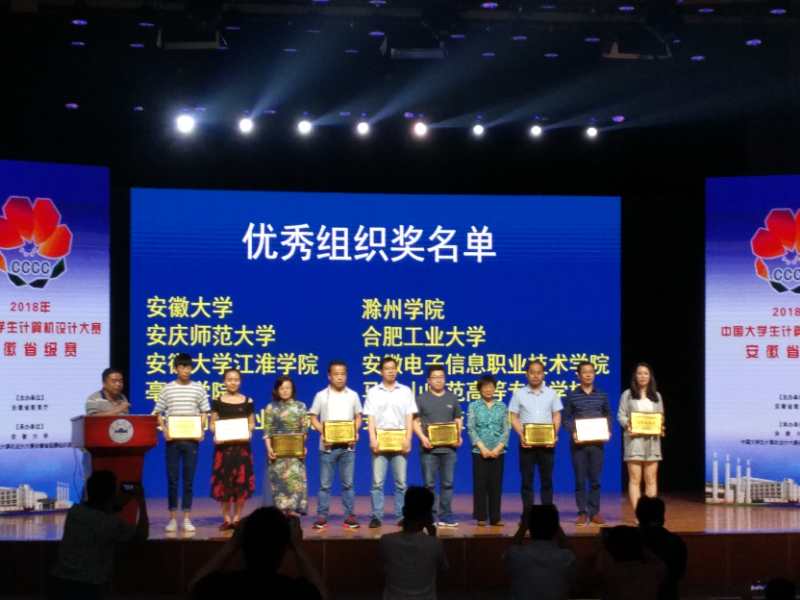 本网讯 5月27日,2018年中国大学生计算机设计大赛安徽省级赛优秀作品展示暨颁奖大会在安徽大学馨苑校区举行,马鞍山师专荣获一等奖2项、二等奖3项、三等奖7项、优胜奖17项,竞赛成绩名列全省高职院校前列。学校荣获优秀组织奖,李安东荣获优秀赛务工作者荣誉称号。