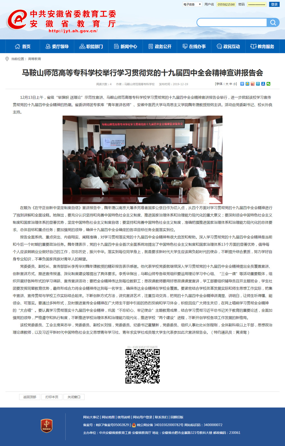 【安徽教育网】bat365中文官方网站举行学习贯彻党的十九届四中全会精神宣讲报告会