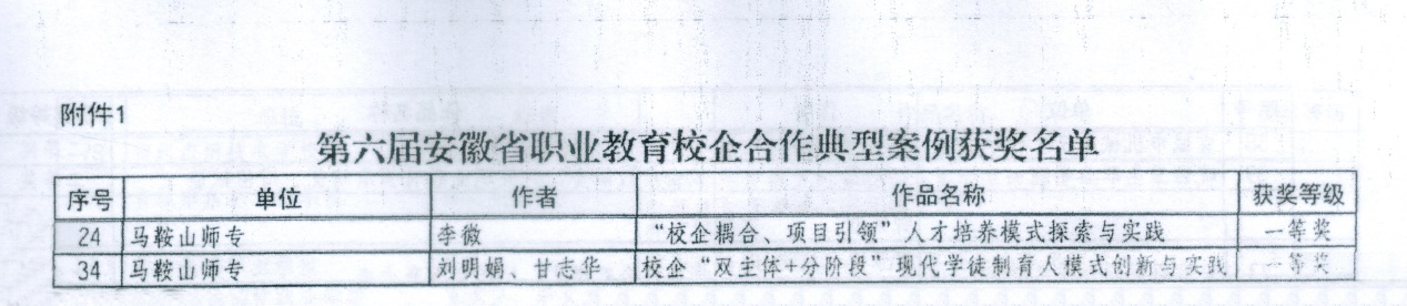 近日,安徽省教育厅办公室印发关于公布第六届安徽省职业教育校企合作典型案例征集和主题征文评选获奖名单的通知,李微;刘明娟、甘志华两个团队分别荣获一等奖。详见附表: