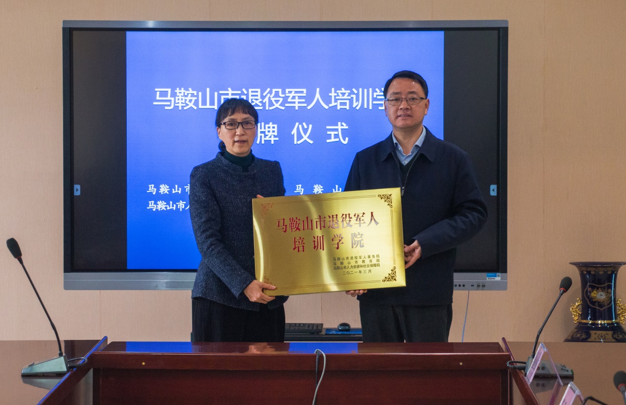 本网讯 为进一步做好退役军人的培训工作,提高退役军人的职业技能水平,3月18日上午,马鞍山市退役军人培训学院授牌仪式在bat365中文官方网站举行。马鞍山市政府副市长杨善斌,校党委副书记、校长刘淑风出席仪式。市政府副秘书长刘观林,校党委委员、副校长、统战部长张勇军参加仪式。
