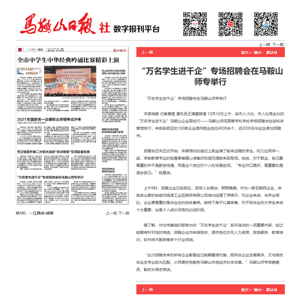 【马鞍山日报】“万名学生进千企”专场招聘会在马鞍山师专举行