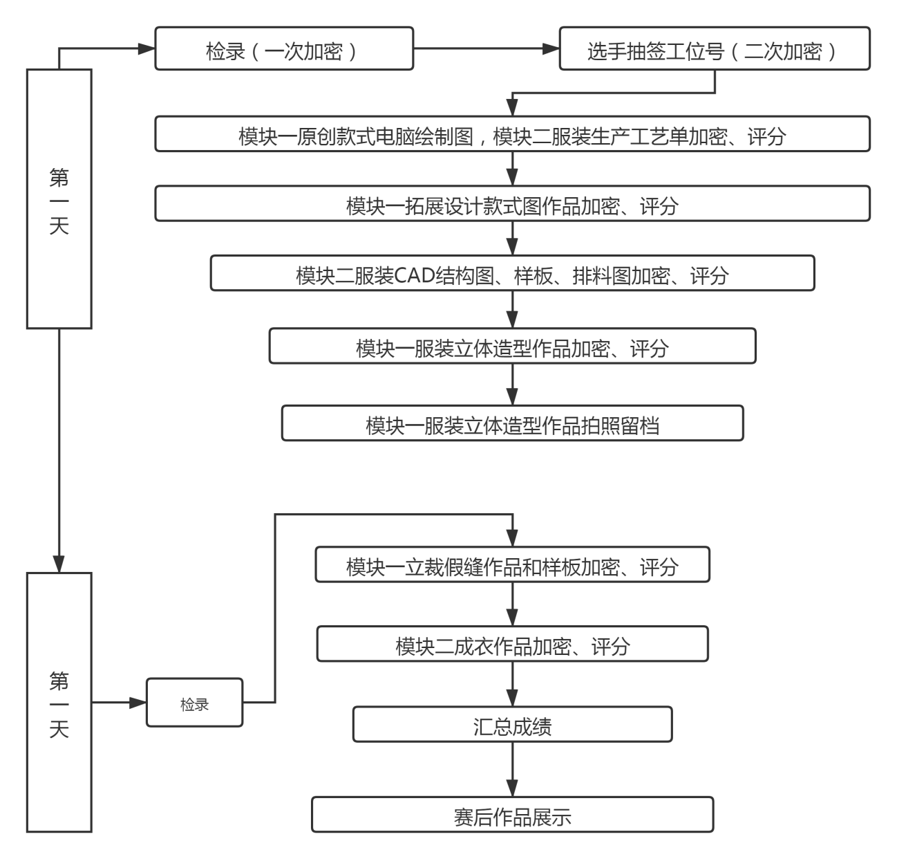 服装原创款式设计 | 0.5 | 第一天 9:00-9:30 | 第一天所有竞赛任务时间打通,并在第一天结束时提交前三项任务的作品。
