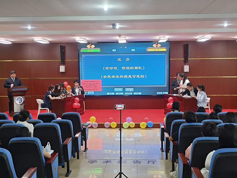 经过初赛的过关斩将,共有四支队伍成功晋级决赛,分别是来自雨山校区的“从容应队”“你说的都队”“我竟无言以队”和来自滨江校区的“对对对,你说的都队”。四支队伍围绕辩题“全民关注热搜是可喜的还是可悲的”通过车轮赛的方式展开激烈辩论。