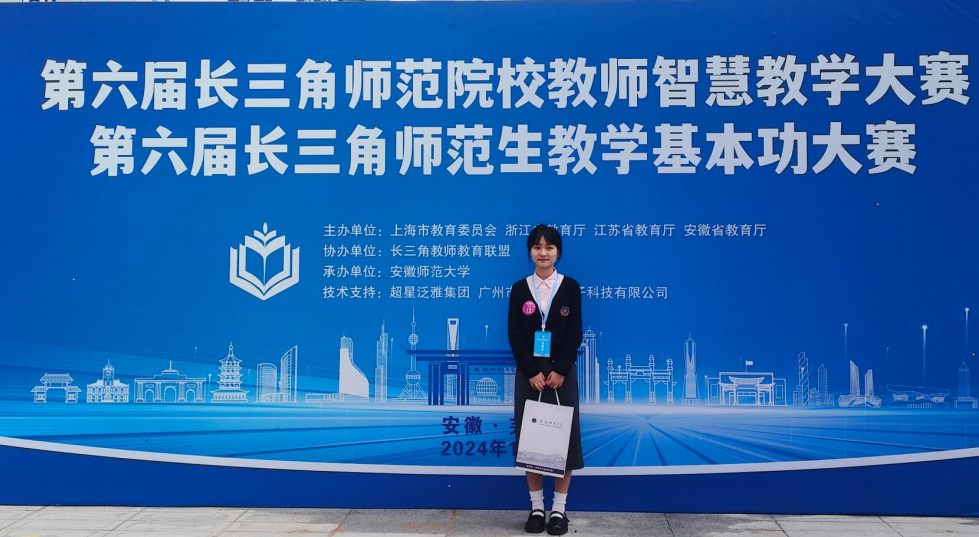在刚刚结束的第六届长三角师范生教学基本功大赛中,吴梦瑶同学获小学组三等奖的好成绩。此次比赛共有来自华东师范大学、南京师范大学、上海师范大学、江苏师范大学、安徽师范大学等高校的292名师范生参加本次大赛。比赛由现场撰写教学设计、现场制作课件、即席演讲、有生上课(含板书)等四个考核项目组成。