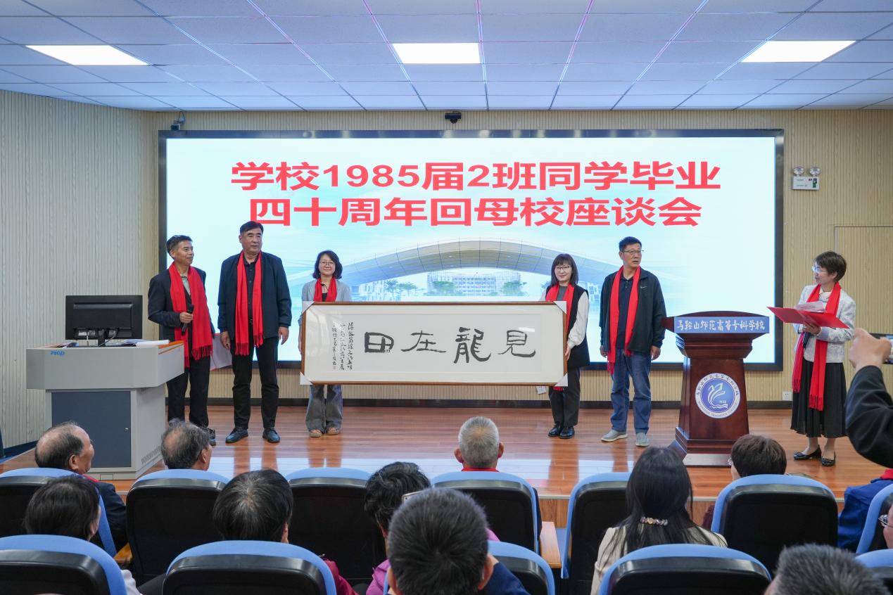 参观后,以“感恩、重逢、传承”为主题的座谈会召开,校友代表向母校赠送纪念品。随后大家共同观看了上学时期的老照片视频合集与部分因事未能到场的校友录制的祝福短片,回忆曾经的青春时光,感悟师恩与同窗情。该班教师代表潘德安老师与校友代表唐红卫分别致辞。