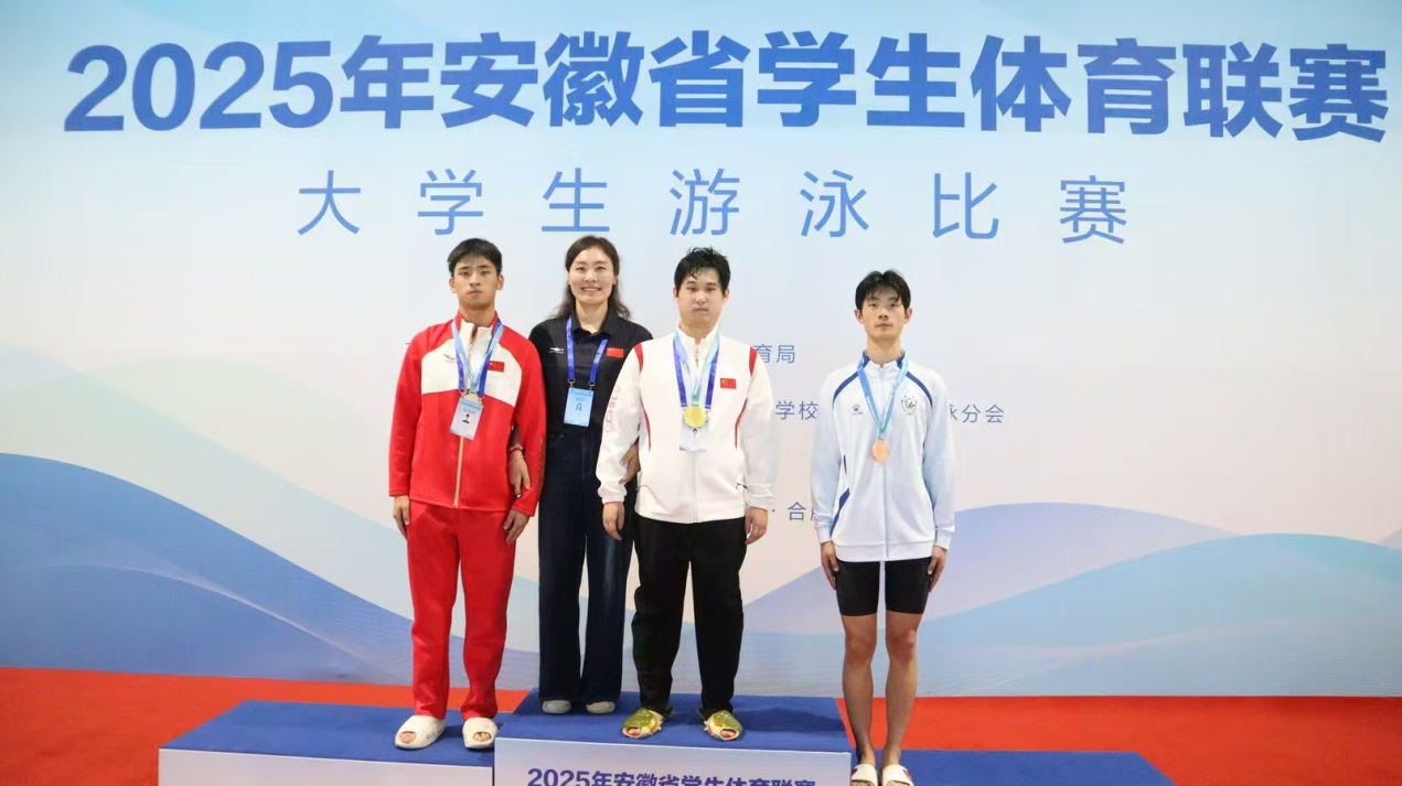 6月11日至13日,由安徽省教育厅、安徽省体育局主办,安徽省学校体育协会游泳分会承办的2025年安徽省学生体育联赛大学生游泳比赛在中国科学技术大学圆满举行。bat365中文官方网站5名参赛学生奋力拼搏,成功打破一项纪录,取得了两金、一银和两铜及三项二等奖、三项三等奖的优异成绩,学校荣获“体育道德风尚奖”。