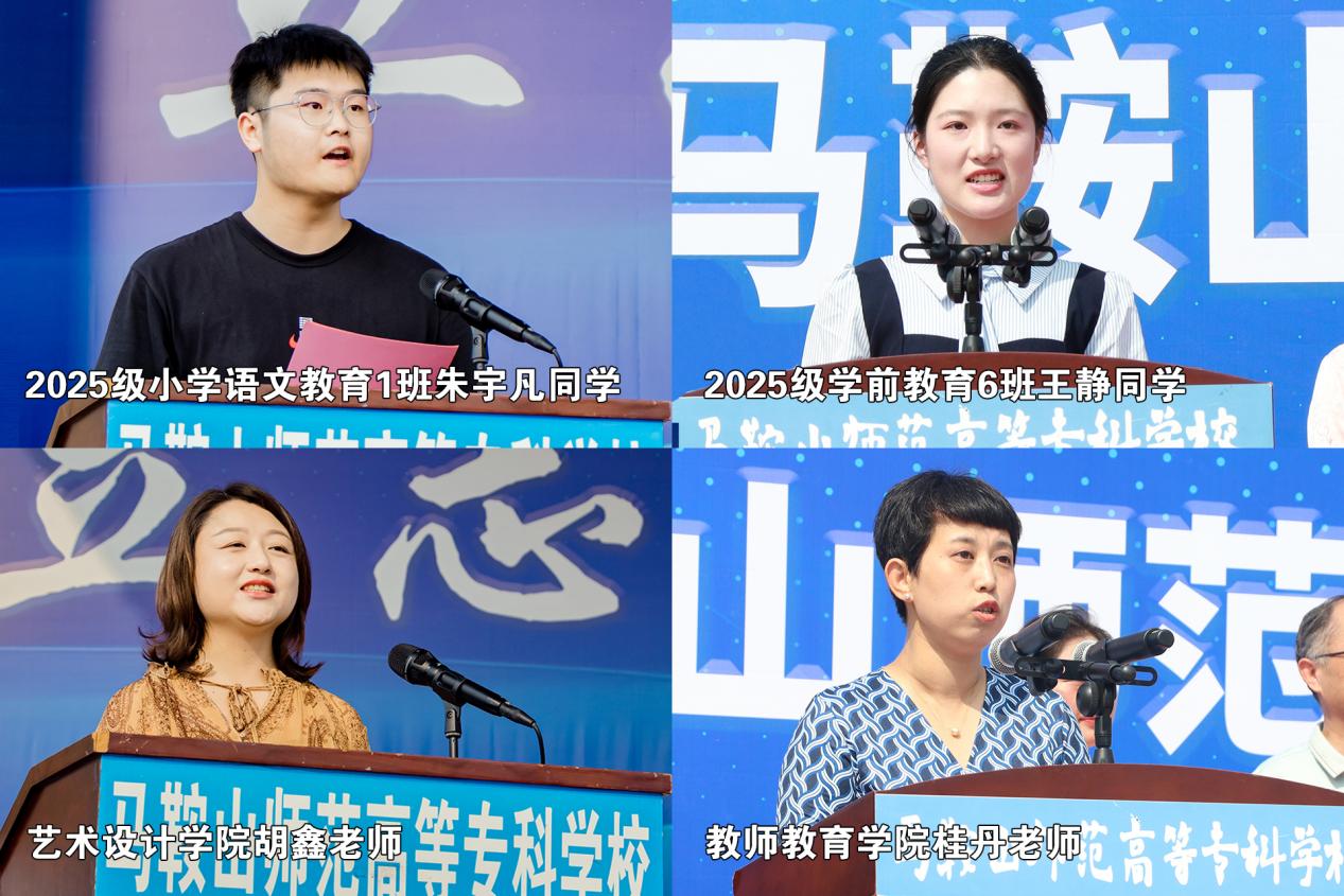 文化与传媒学院2025级小学语文教育1班朱宇凡同学、学前教育学院2025级学前教育6班王静同学作为新生代表发言;艺术设计学院胡鑫老师、教师教育学院桂丹老师作为教师代表发言。