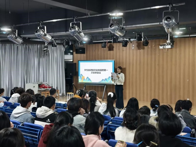 为推进学生自律委员会工作有序开展,完成新老交替,明确工作方向。2025年10月22日晚上,学生自律委员会换届暨第一次全体会议在大阶梯教室一如期举行。学生处副处长晋愈飞、学生公寓管理中心主任靳贺、学生公寓管理中心老师叶淑琳出席会议,会议由学生自律委员会成员张雅茹主持。