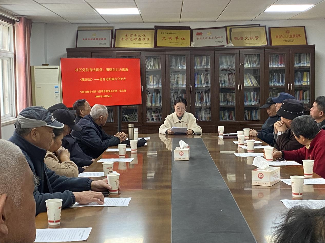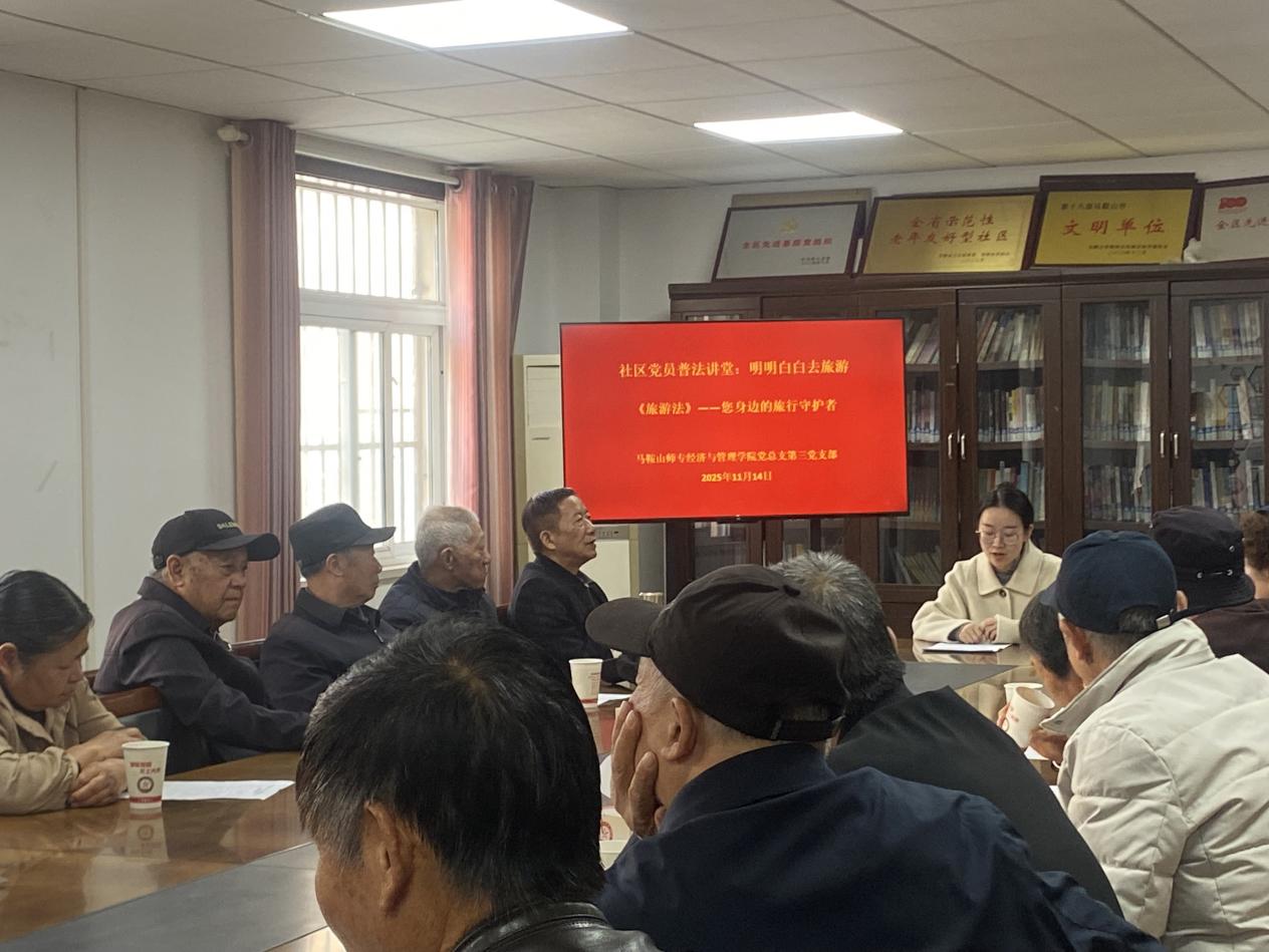 根据经济与管理学院“党建引领往前赶”专项行动工作安排,2025年11月14日下午,经管学院党总支第三党支部书记王妮妮同志带领支部党员走进映翠社区,与映翠社区老年党员联合开展“普法护航乐享银龄”支部共建活动。活动聚焦老年群体旅游维权热点,通过以案释法、互动答疑、发放“法律小锦囊”等形式,为社区的叔叔阿姨送上了一场“干货满满”的法治宣讲。