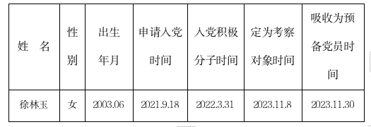 经支委会研究,拟定于2024 年12 月11日召开党员支部大会,对预备党员徐林玉转为中共正式党员进行讨论,望广大师生予以监督。如不符合转正条件,请在公示之日起七天内向本支部或上级党委举报,并提供必要的证据。反馈电话: 83803652 。