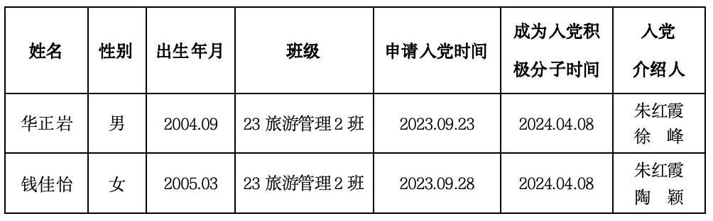 经本人申请,组织审查,支委会讨论研究,拟接收华正岩等同志为党的发展对象。按照发展党员的程序与规定,现将以下同志有关情况予以公示,请监督。具体公示如下: