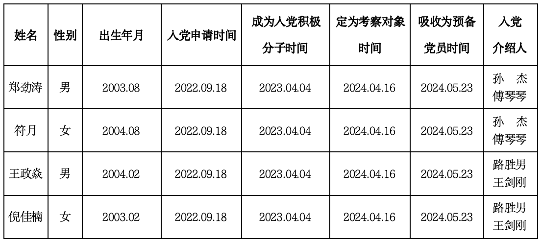 经支委会研究,拟定于2025年5月22日召开党员支部大会,对预备党员郑劲涛等4名同志转为中共正式党员进行讨论,望广大师生予以监督。如不符合转正条件,请在公示之日起七天内向本支部或上级党委举报,并提供必要的证据。反馈电话:83803652。
