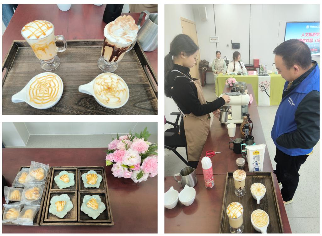 旅游管理专业的同学们则通过深入挖掘旅游资源和发展战略,呈现了一份“文旅赋能乡村振兴,助力共同富裕——以义乌市‘望道信仰’精品线为例”的调研报告。此外,他们还现场展示了意式咖啡制作和蛋糕成品展示,这些作品展示了同学们的实践能力和创新精神,通过分享经验和知识,让观众们感受到了美食文化的魅力和旅游管理专业的实践魅力。