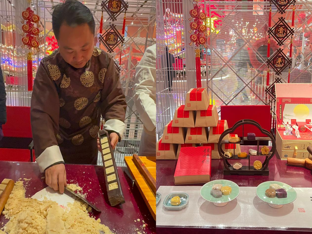 大红灯笼高高挂起,各式非遗展品琳琅满目,人声鼎沸,热闹非凡。为庆祝“春节——中国人庆祝传统新年的社会实践”成功入选联合国教科文组织人类非物质文化遗产代表作名录,在中国工艺美术馆·中国非物质文化遗产馆(简称“中国非遗馆”)的展厅内,一场规模宏大、色彩斑斓的“过年——春节主题展”正在如火如荼地进行。在这一片繁华之中,婺式糕点代表性传承人楼洪亮——义乌工商职业技术学院教师,浙江省高技能拔尖人才,浙江金蓝领,浙江省技能大师工作室领办人,携其团队为观众带来一场视觉与味觉的双重盛宴。