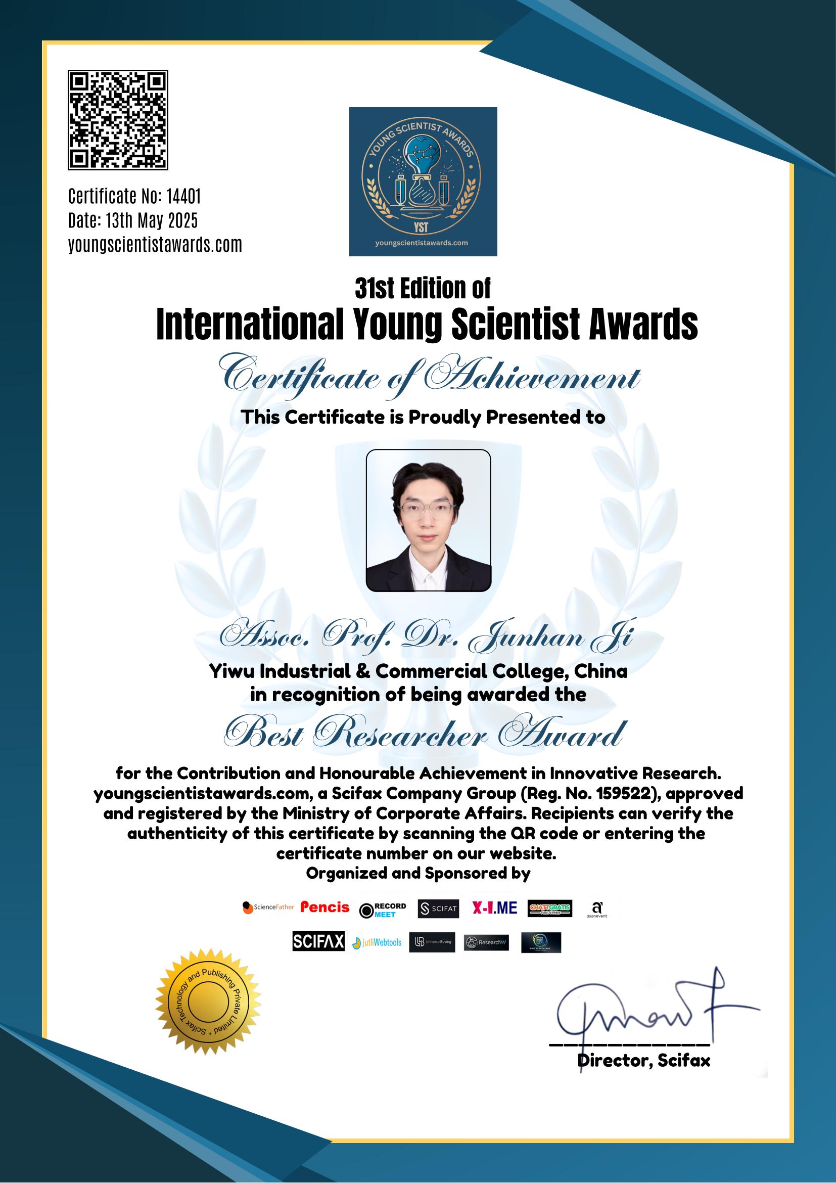 近日,义乌工商职业技术学院澳门十大信誉网赌大全青年教师季俊含博士因其在“角色冲突与中国社会工作者离职意向关系研究”方面取得的重要进展,荣获国际知名学术组织Science Father主办的第31届国际学术奖项(2025 31st Edition of International Academic Awards)“最佳研究者奖”(Best Researcher Award: For the Contribution and Honourable Achievement in Innovative Research)。