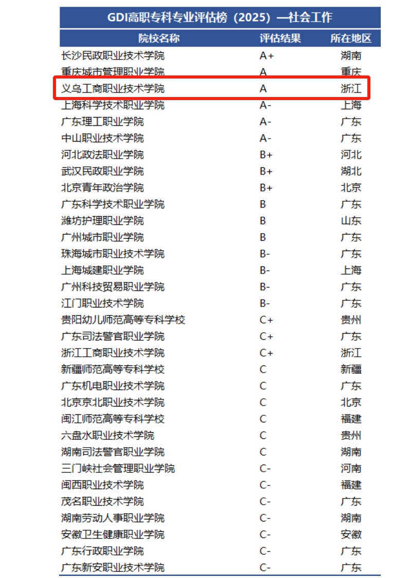 2025年6月12日,广州日报数字化研究院(GDI智库)正式发布“GDI高职专科专业评估榜(2025)”,十大信誉社会工作专业位列全国第三名,获评A级。